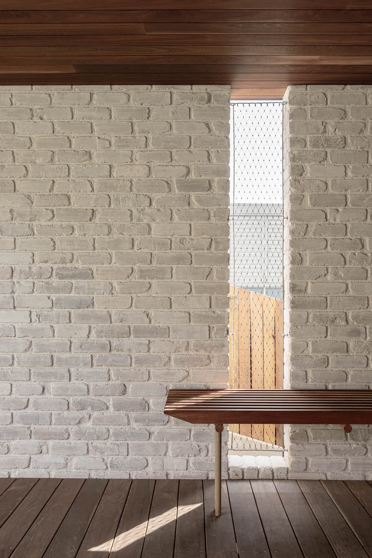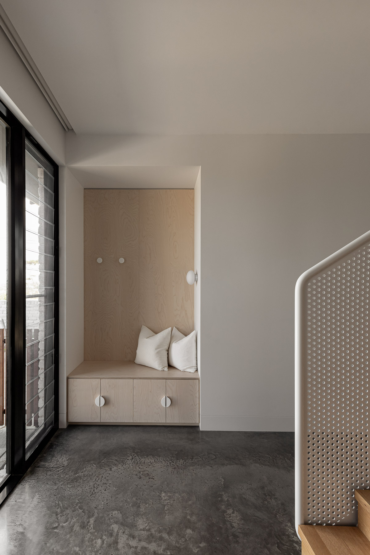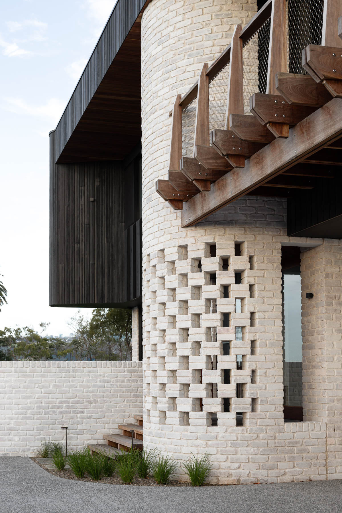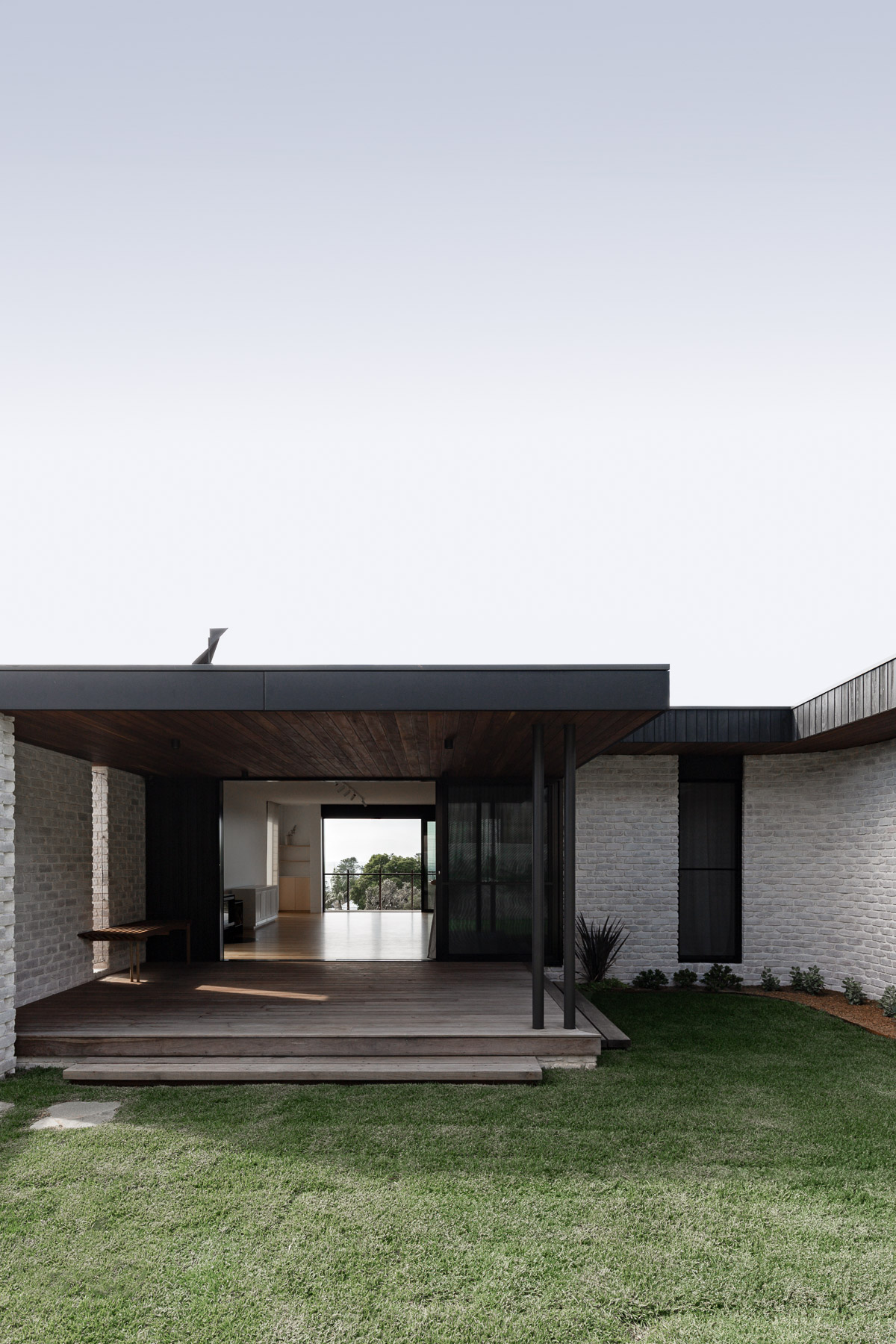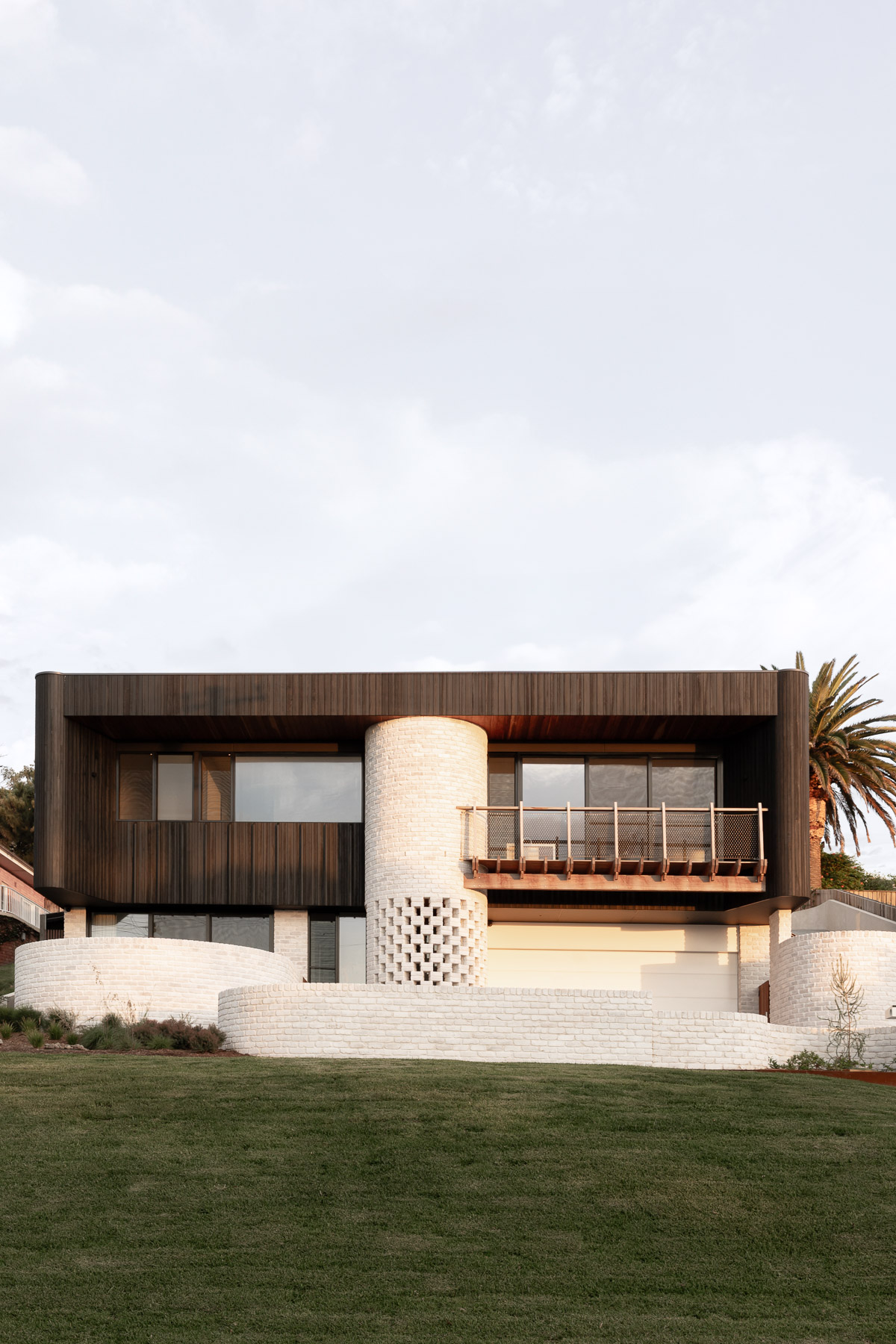 against harsh coastal conditions and brings visual cohesion, anchoring both homes gently into the landscape. Internally, the lower level is grounded in robust materials, including burnished concrete floors, limewashed brick walls, and perforated steel. The upper floor is softened and refined with Victorian ash, terrazzo, and whitewashed plywood. As night falls, lighting illuminates the hit-and-miss brickwork at the entry, casting a quiet, lantern-like glow.