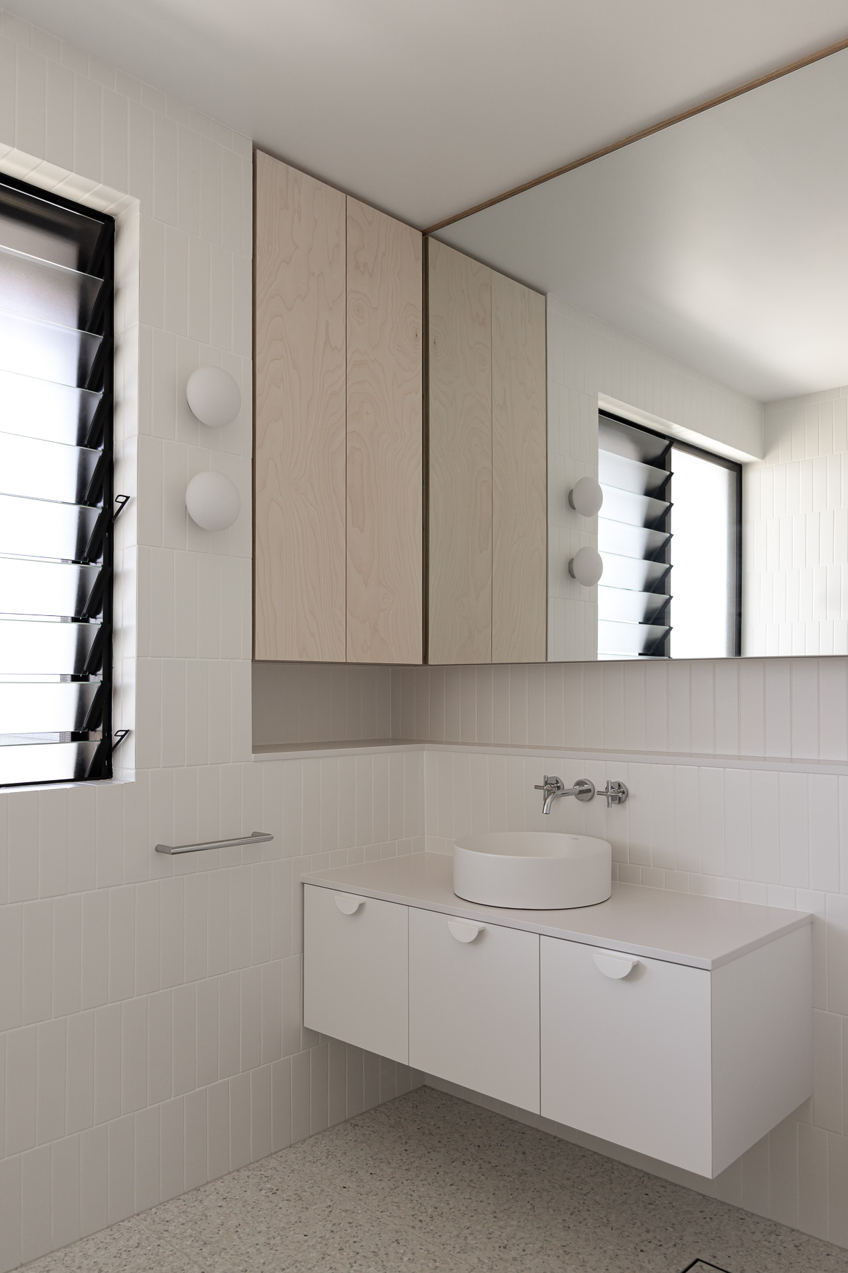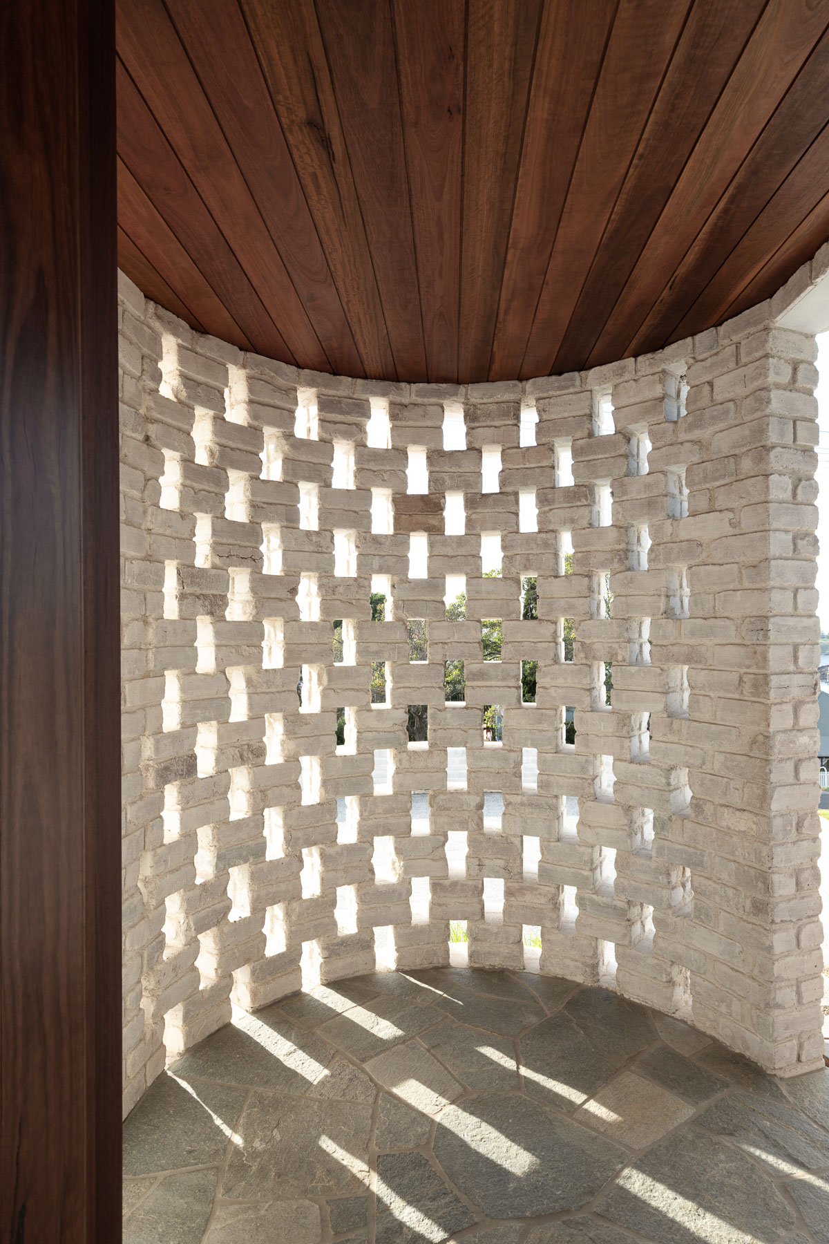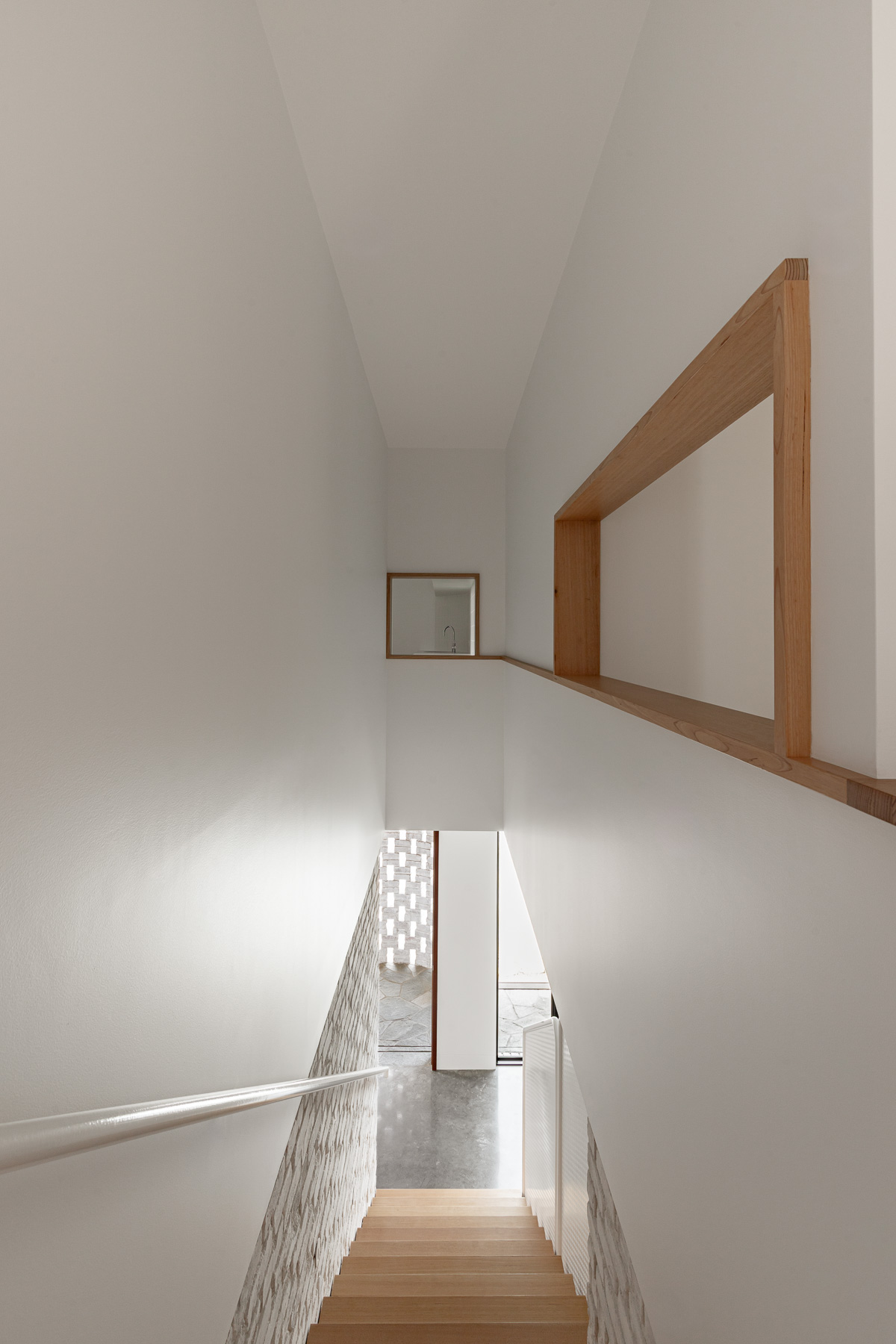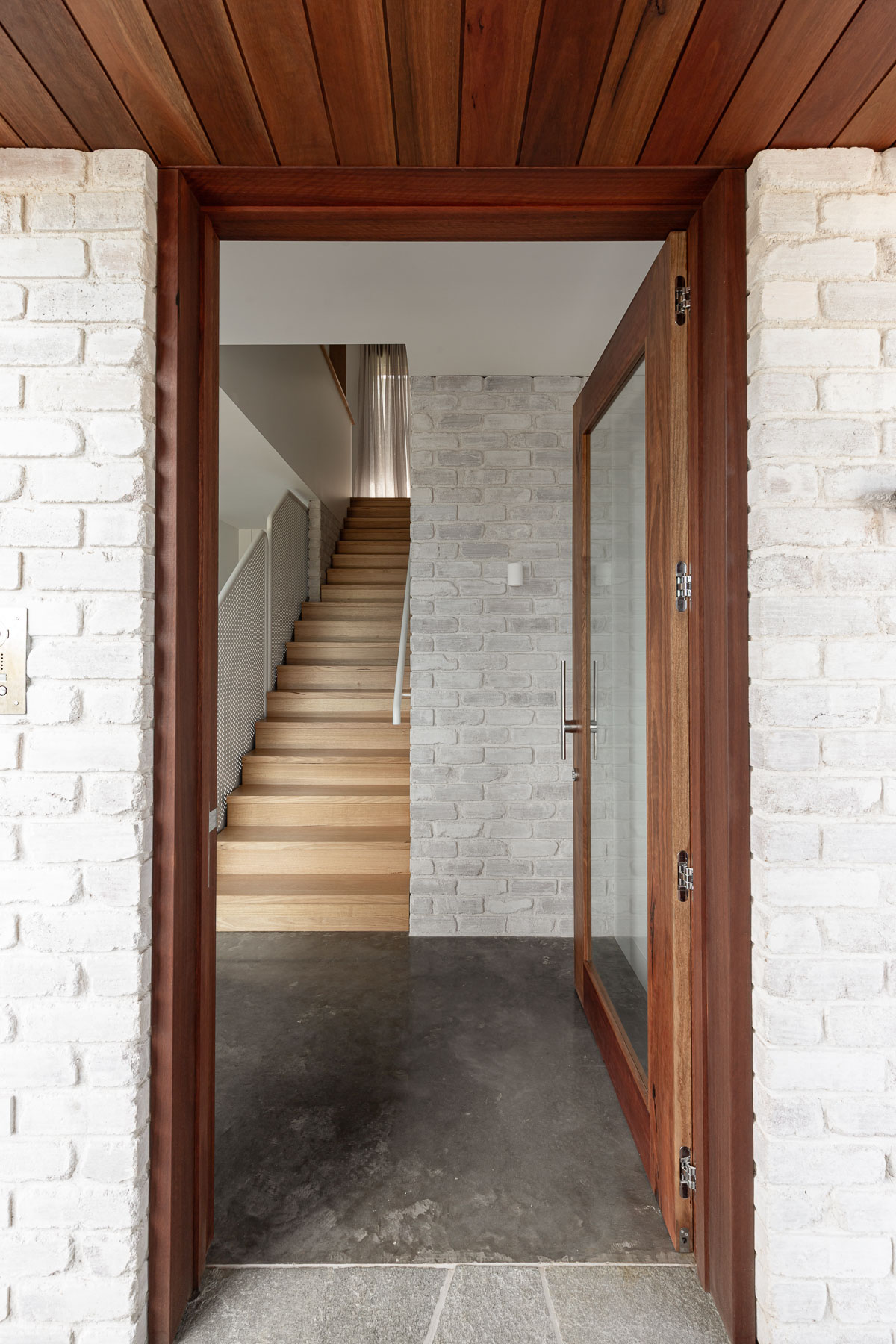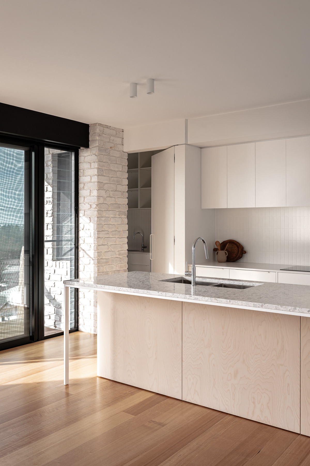 against harsh coastal conditions and brings visual cohesion, anchoring both homes gently into the landscape. Internally, the lower level is grounded in robust materials, including burnished concrete floors, limewashed brick walls, and perforated steel. The upper floor is softened and refined with Victorian ash, terrazzo, and whitewashed plywood. As night falls, lighting illuminates the hit-and-miss brickwork at the entry, casting a quiet, lantern-like glow.