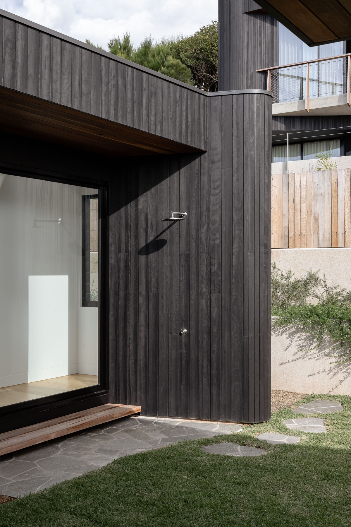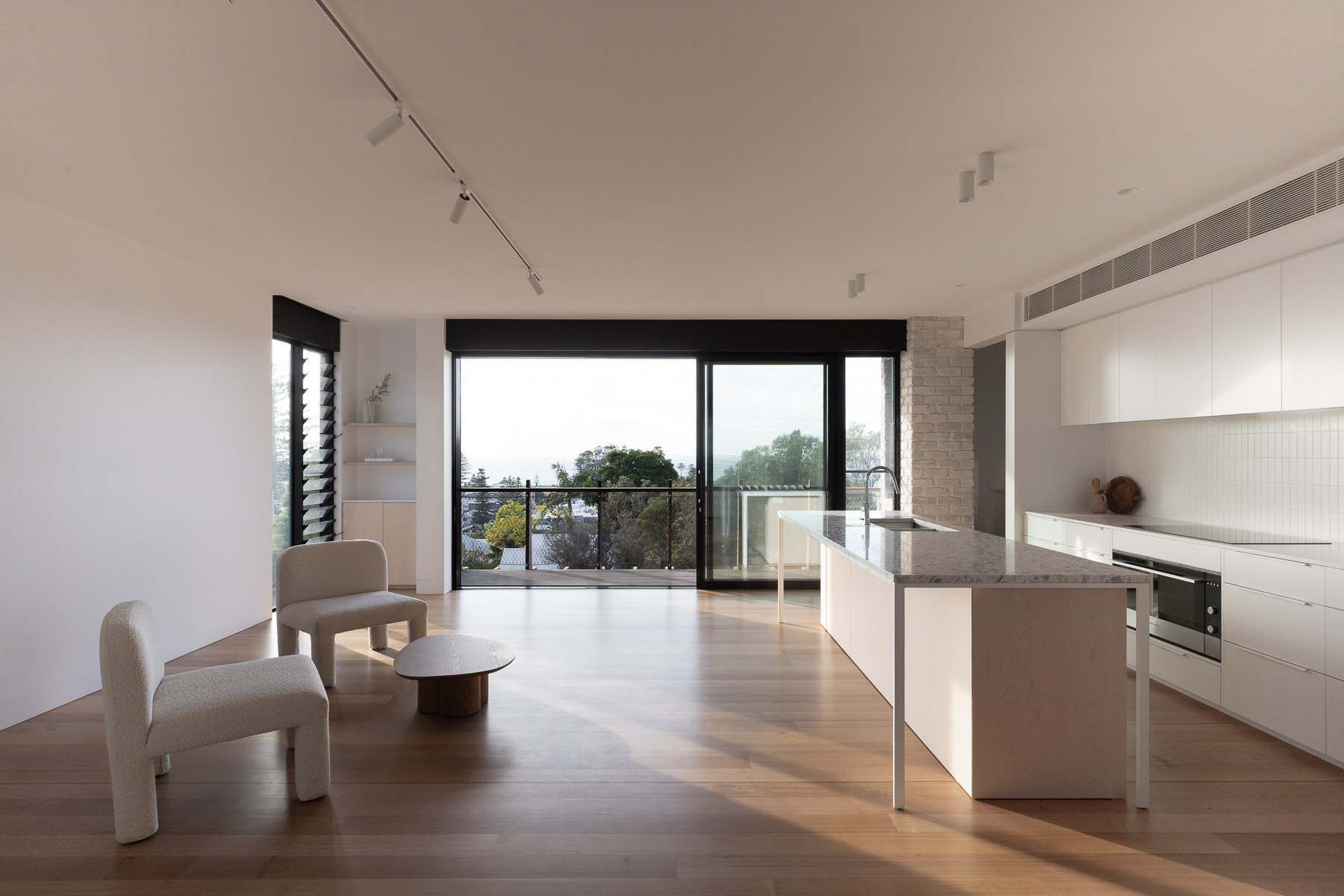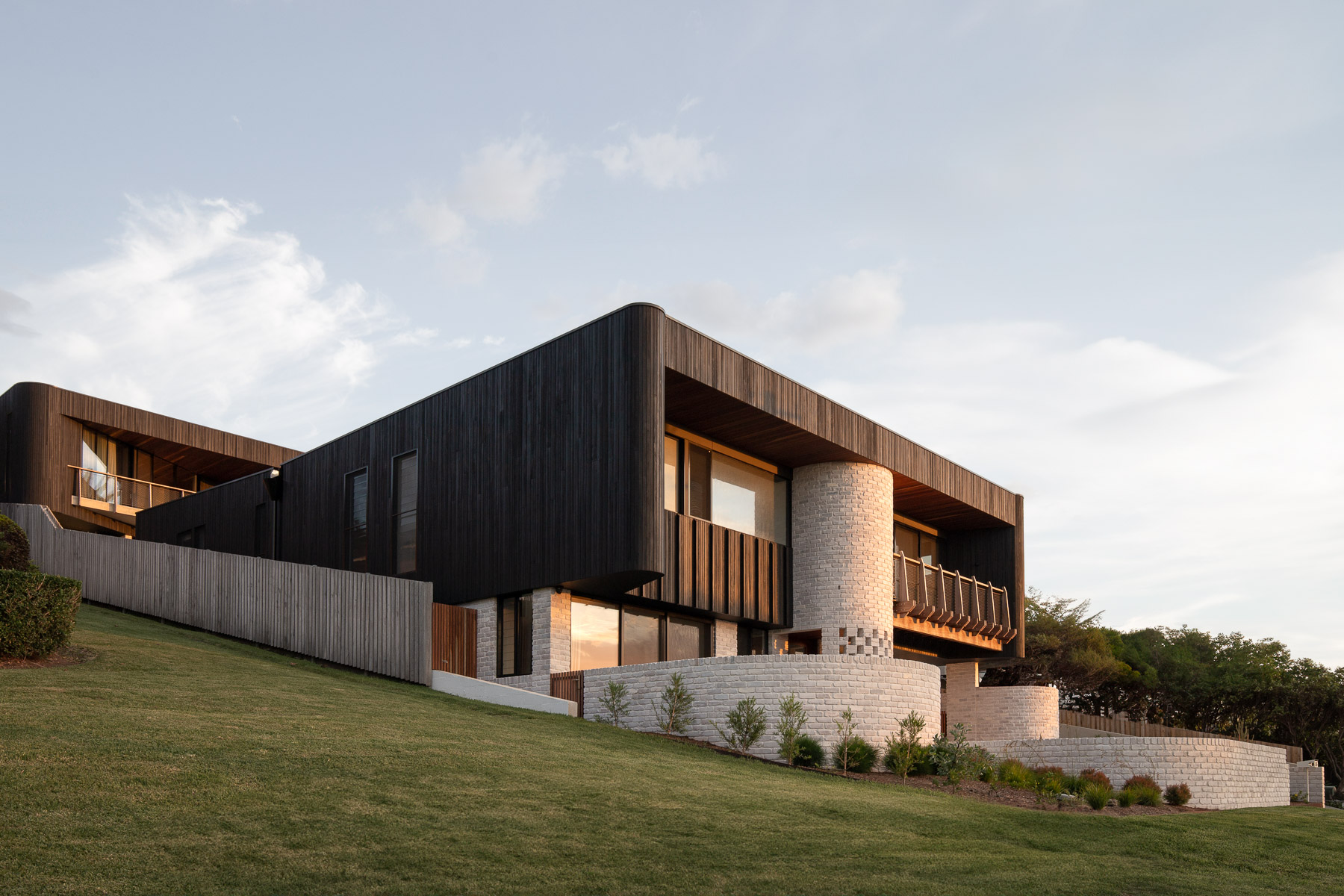 Perched on a steep site above Kiama Harbour and Surf Beach, this residence forms one half of a carefully composed pair of coastal homes. Oriented to capture sweeping views through the treetops to the ocean beyond, the dwellings were designed in tandem following the subdivision of the original block. While the upper home was conceived as a private holiday retreat for the client, this lower residence was designed speculatively, to suit a range of future occupants. The plan is flexible and restrained, offering a considered response to site, aspect, and potential lifestyle. Balconies and courtyards are positioned to preserve privacy and view lines between the two homes while maintaining solar access and spatial generosity. A shared material palette of charred Australian Ironbark and recycled brick provides durability