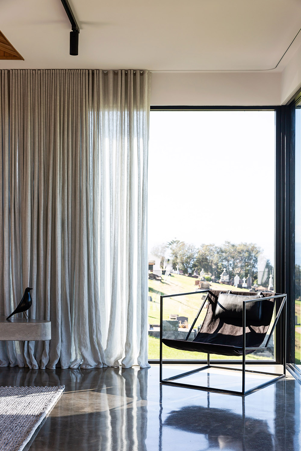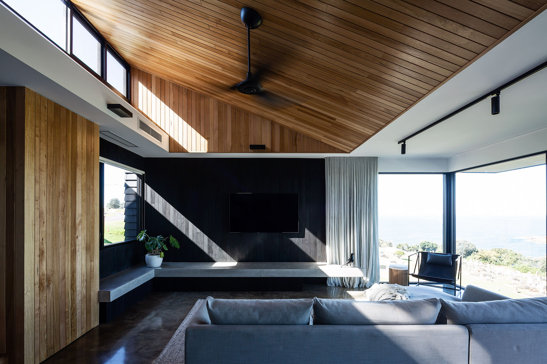 In the main living area, an uninterrupted floor to ceiling corner window allows the panoramic view to be enjoyed from the comfort of the interior, no matter the conditions blowing in from the ocean on the other side of the glass.