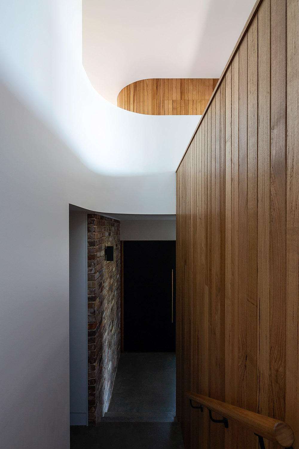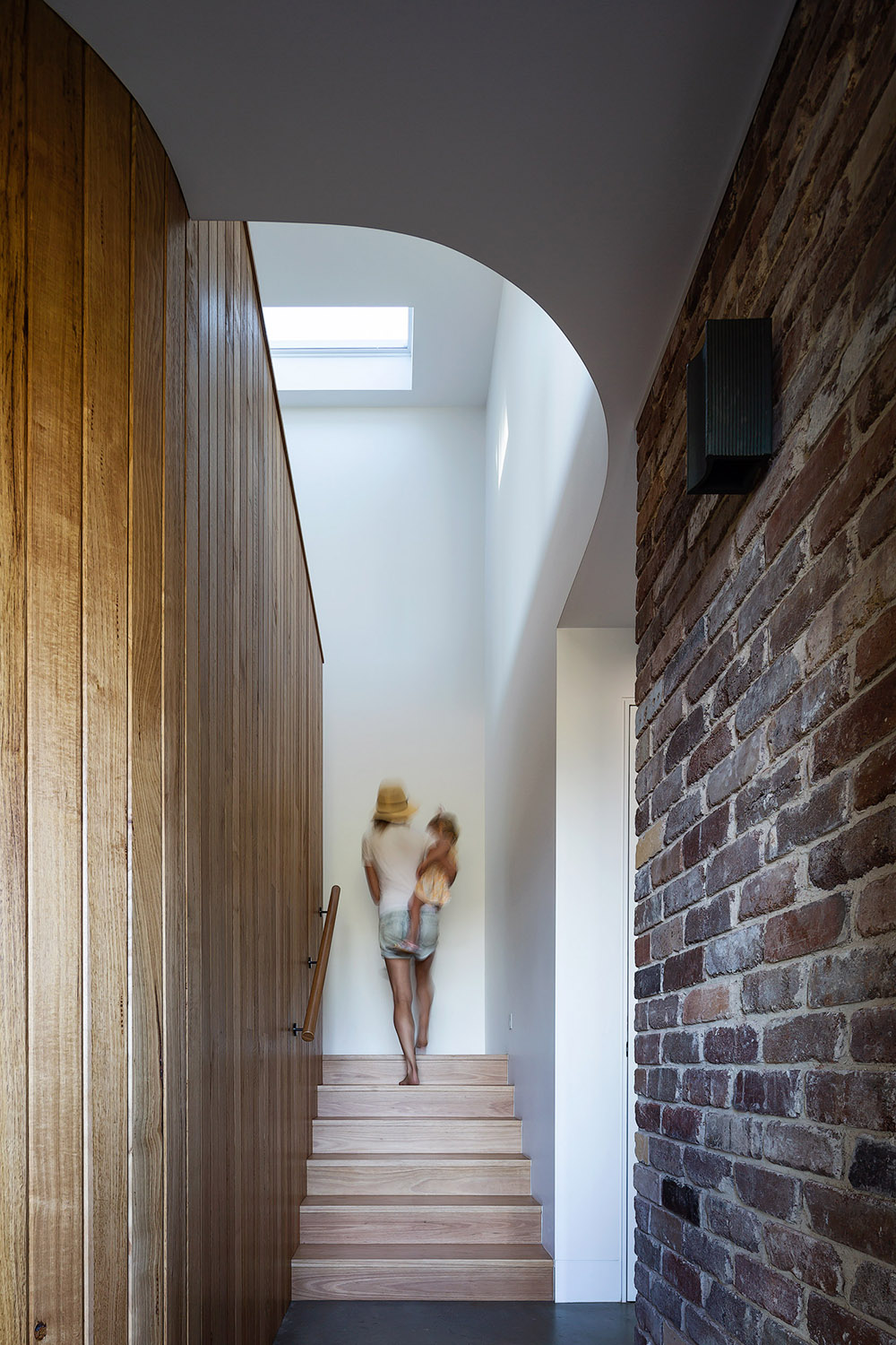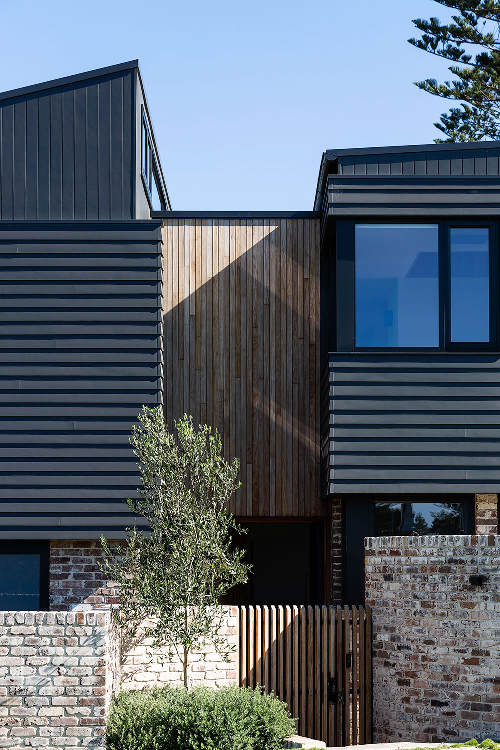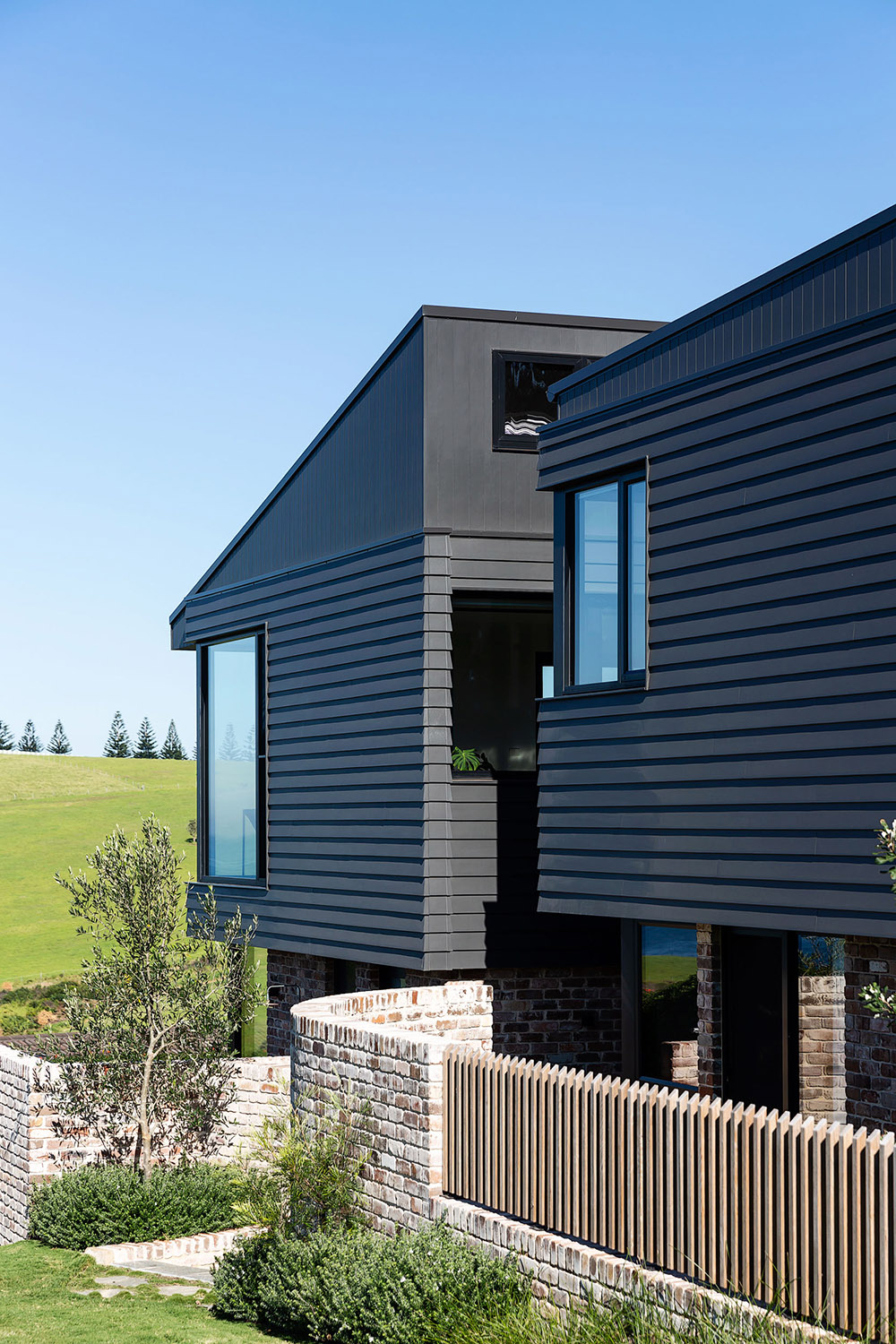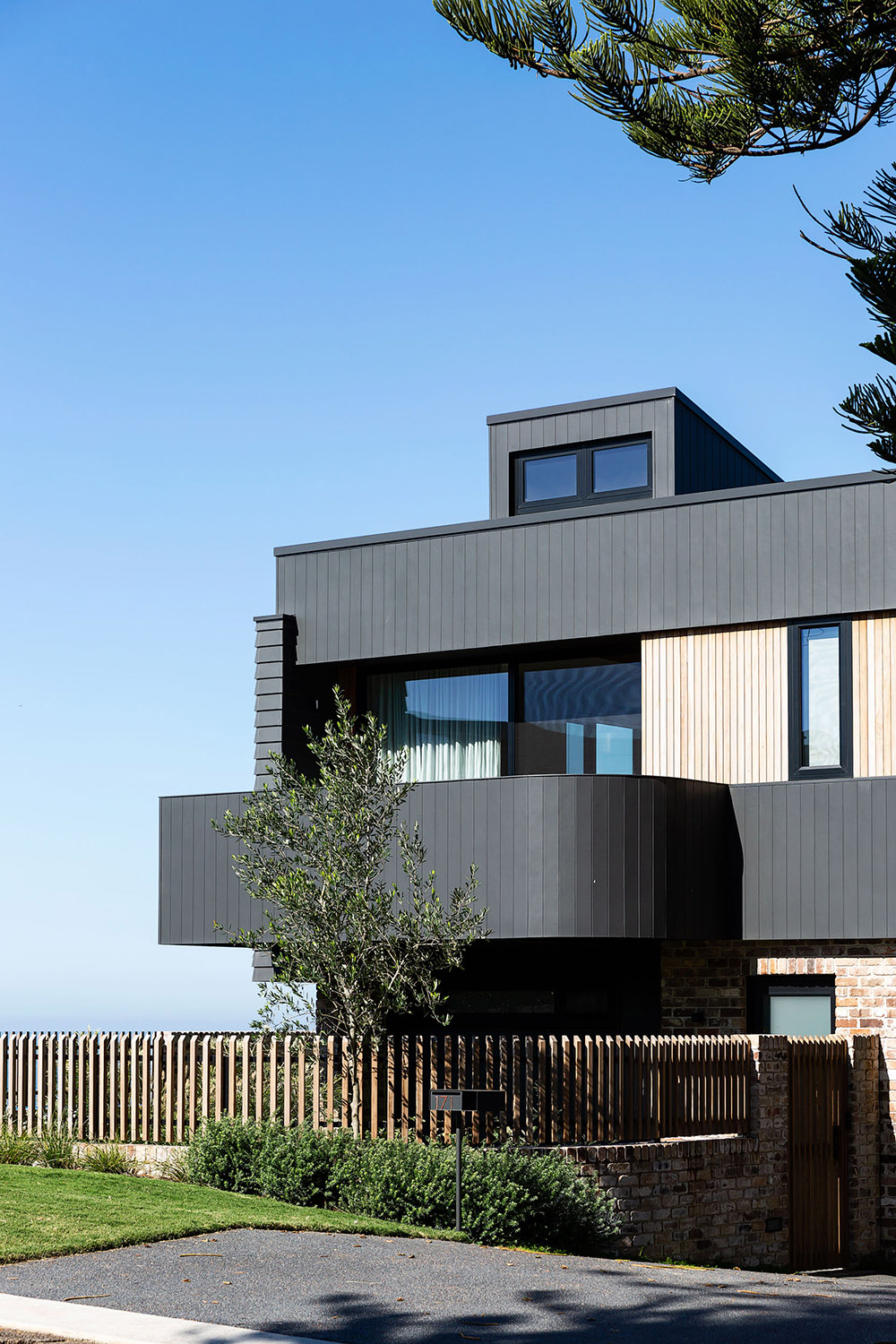 Exposed to southerly winds and storms and fronting the major access road to the local beach, shelter and privacy were the driving factors of the design and spatial planning of this generously-sized five bedroom home. Three pop up roof structures pull natural light and glimpses of the treetops and sky into the living spaces while shielding the inside of the house from the passers-by on the street.