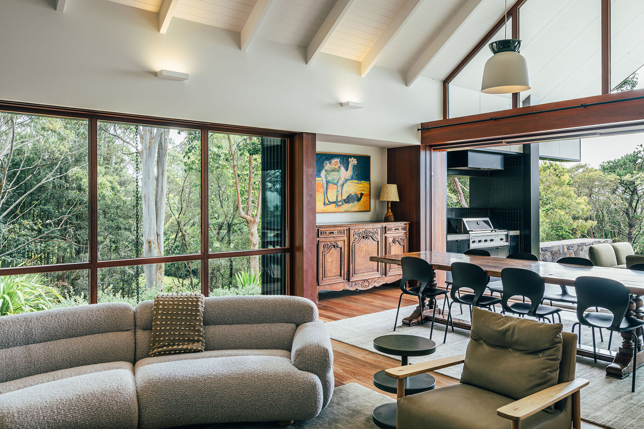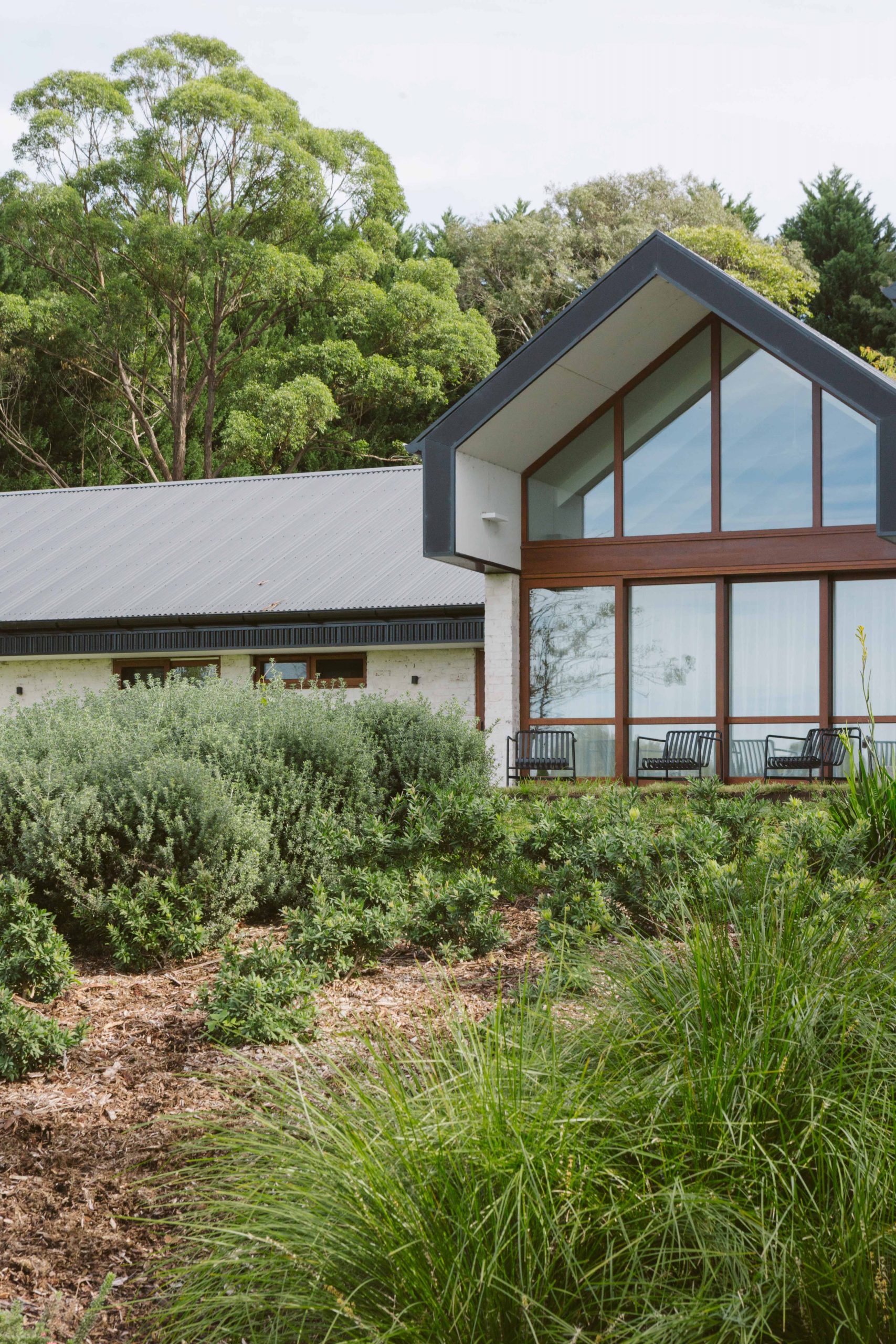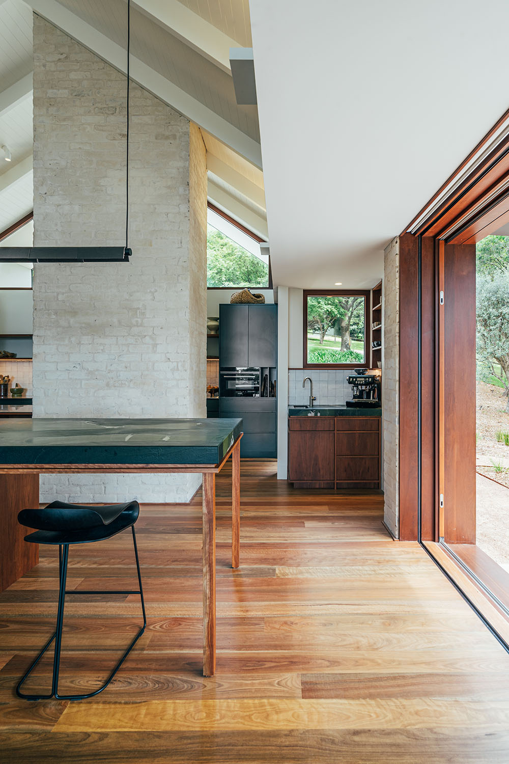 The concrete slab, structural framework and parts of the roof of an existing homestead were retained and added to, creating a sprawling seven bedroom residence. A monumental main room incorporates an open gable roof form, providing an oversized kitchen, dining, and living space fitting for large gatherings. Adjacent, two more moderately scaled rooms provide additional space for guests to spill into, or a more intimate living zone for the couple to enjoy when staying at the property alone.