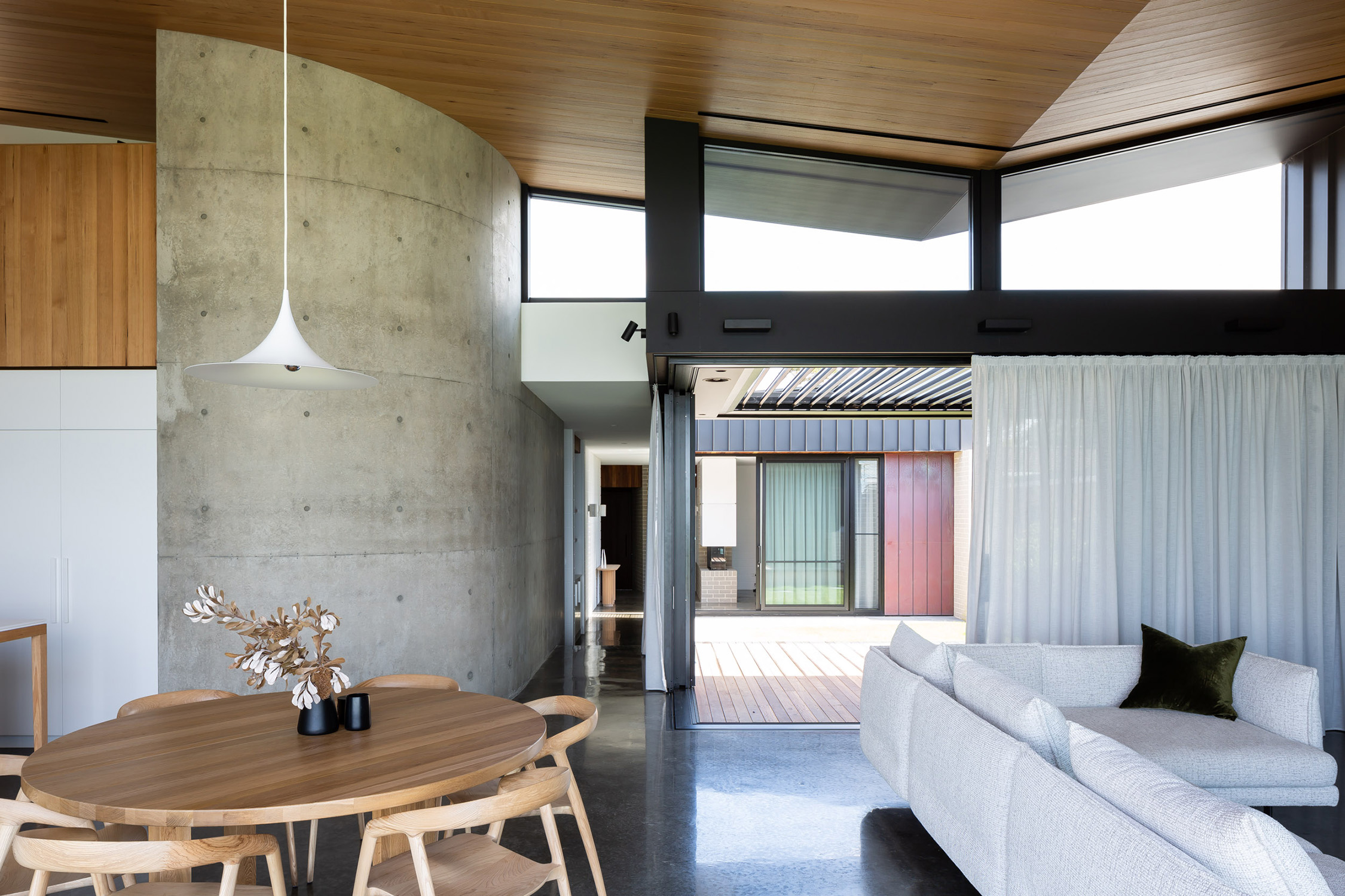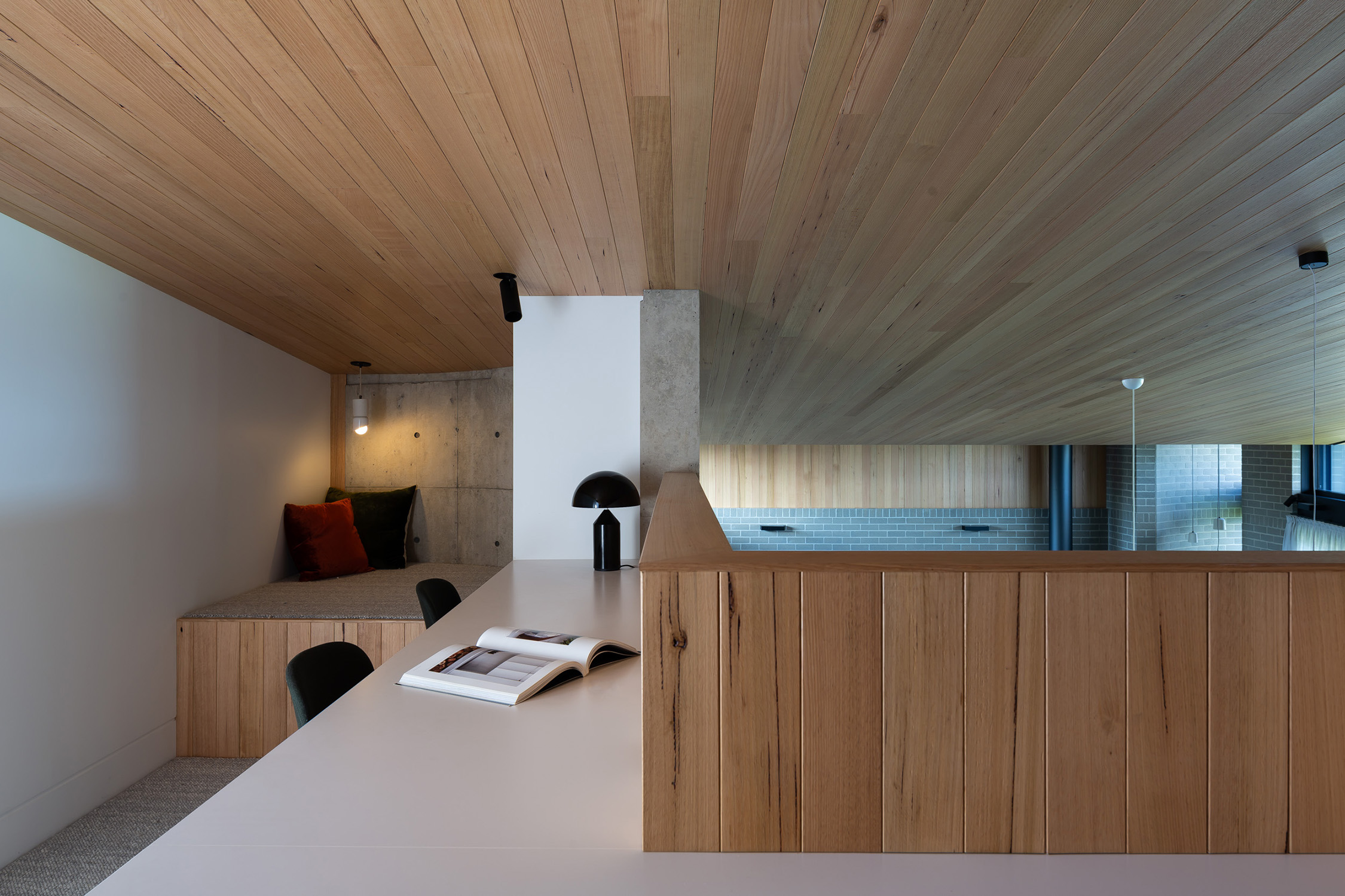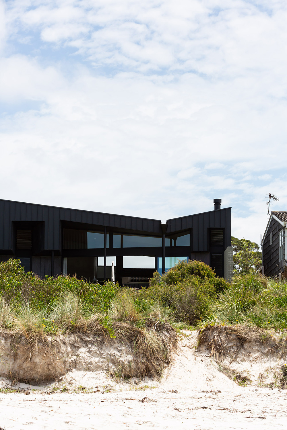 This gentle shift in floor level mimics the experience of walking up and over the surrounding sand dunes, pausing at the top to take in panoramic views of the bay. A material palette of Australian hardwood, copper, matte black aluminium and concrete masonry is robust enough to endure the marine conditions and carries through to the interior to further evoke a sense of refuge.