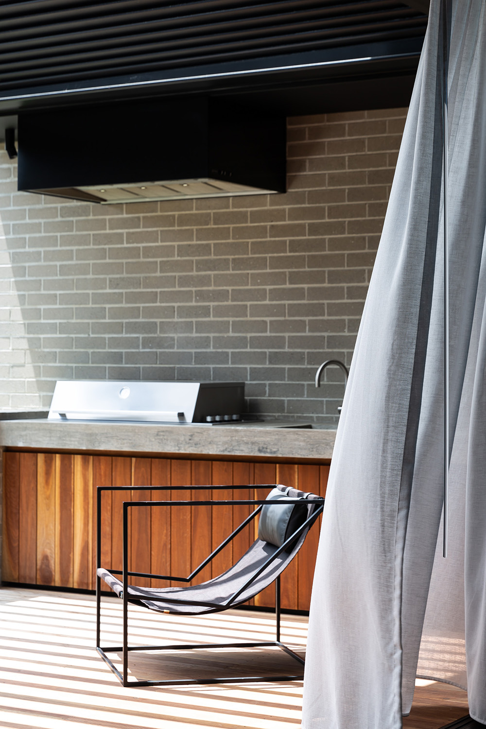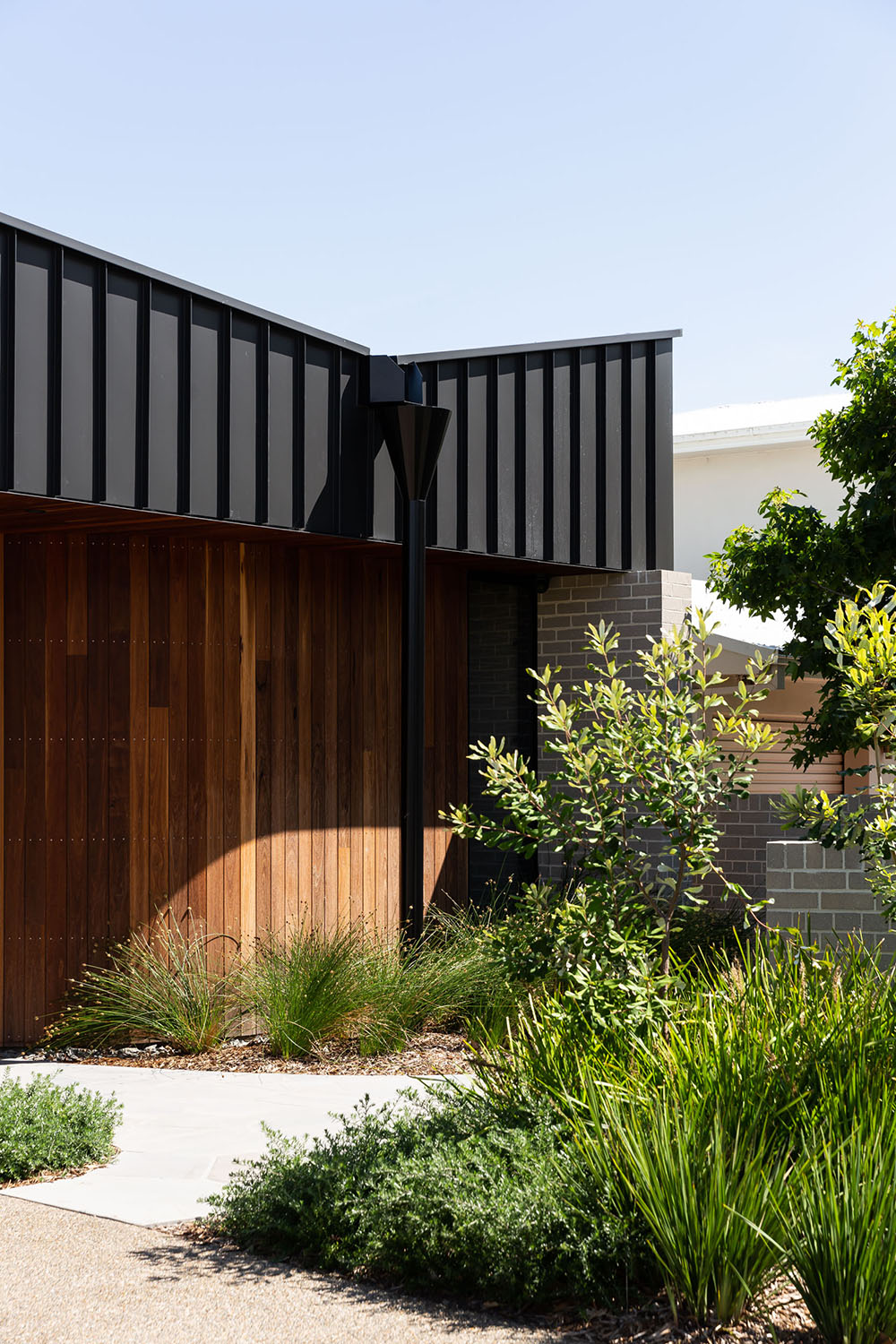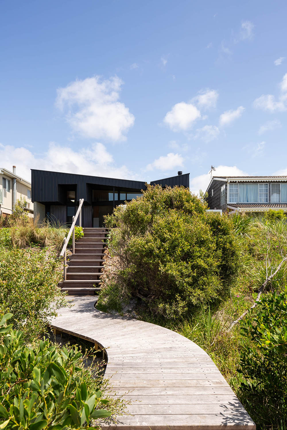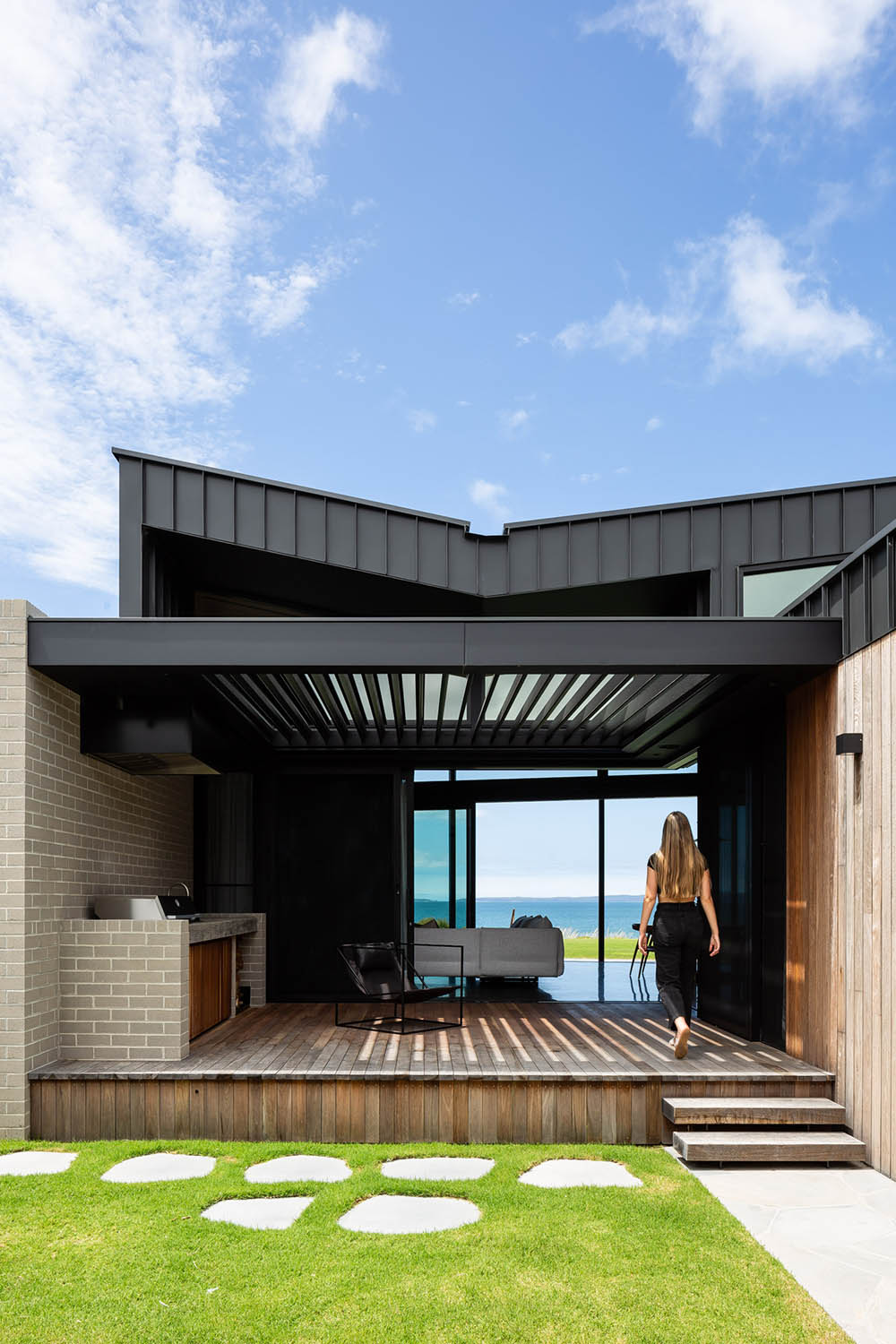 This gentle shift in floor level mimics the experience of walking up and over the surrounding sand dunes, pausing at the top to take in panoramic views of the bay. A material palette of Australian hardwood, copper, matte black aluminium and concrete masonry is robust enough to endure the marine conditions and carries through to the interior to further evoke a sense of refuge.
